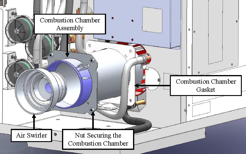 Routine service note: The Aqua-Hot service directions clearly state that the combustion chamber should be removed each time unit is serviced. Most of the service people that I know remove the air swirler as shown in photo below. They Inspect the inside of combustion chamber with flashlight. If there is very minimal carbon built up (which they find in most instances), they do not remove the combustion chamber.